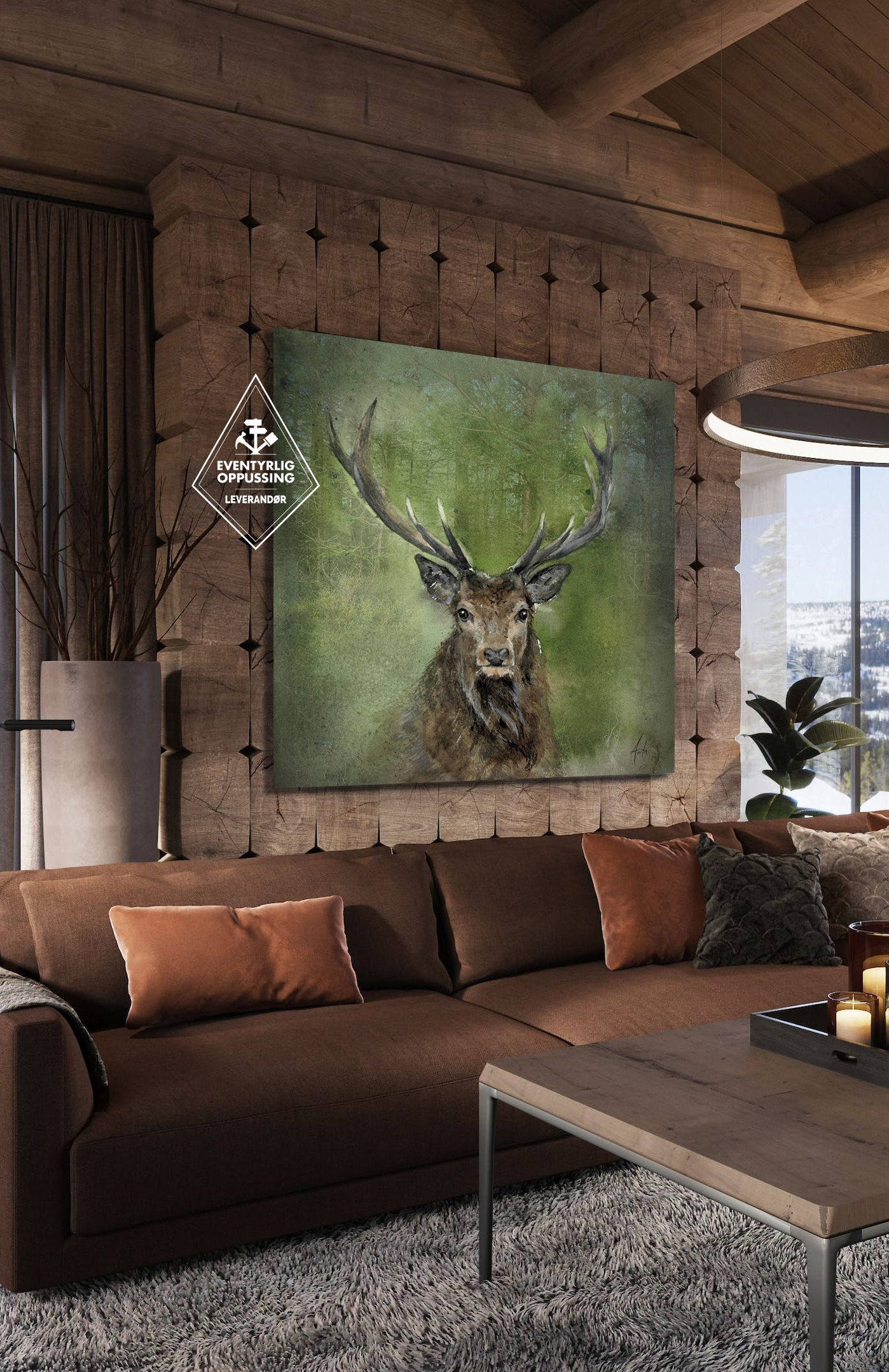 Bildet som heter “Øyeblikket” har varme grønntoner og skogsfarger, som tar Naturen Inn. Man skimter skog i bakgrunnen som gir herlig mystikk. Passer utmerket på hytteveggen!
